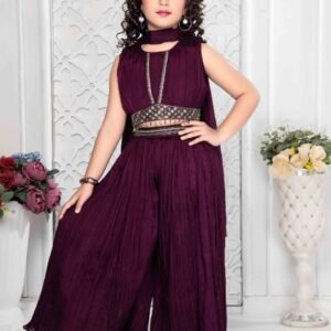 Girls Short Top With Plazo Chinon Fabric Wine Colour